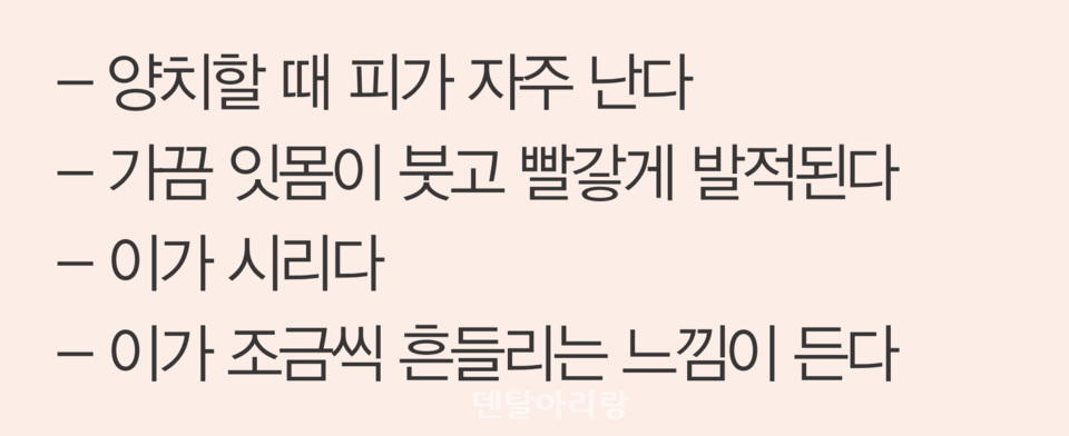 양치할 때 피가 나거나 잇몸이 붓는 느낌이 들면 빠르게 치과로 가시는 걸 추천드린다.